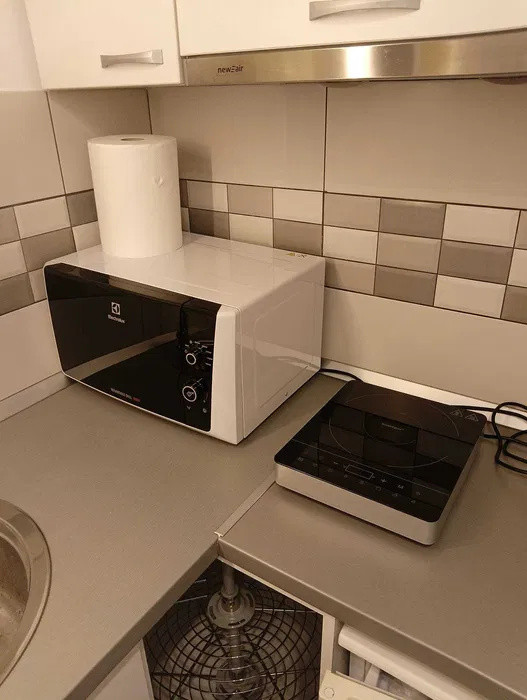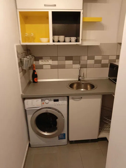 Garsoniera este alcătuită dintr-o cameră principală primitoare, chicinetă complet utilată (mașină de spălat, frigider, cuptor cu microunde, plită cu inducție), baie modernă cu finisaje de calitate, hol și spații de depozitare ingenios integrate.