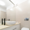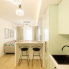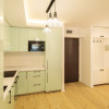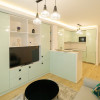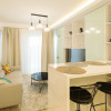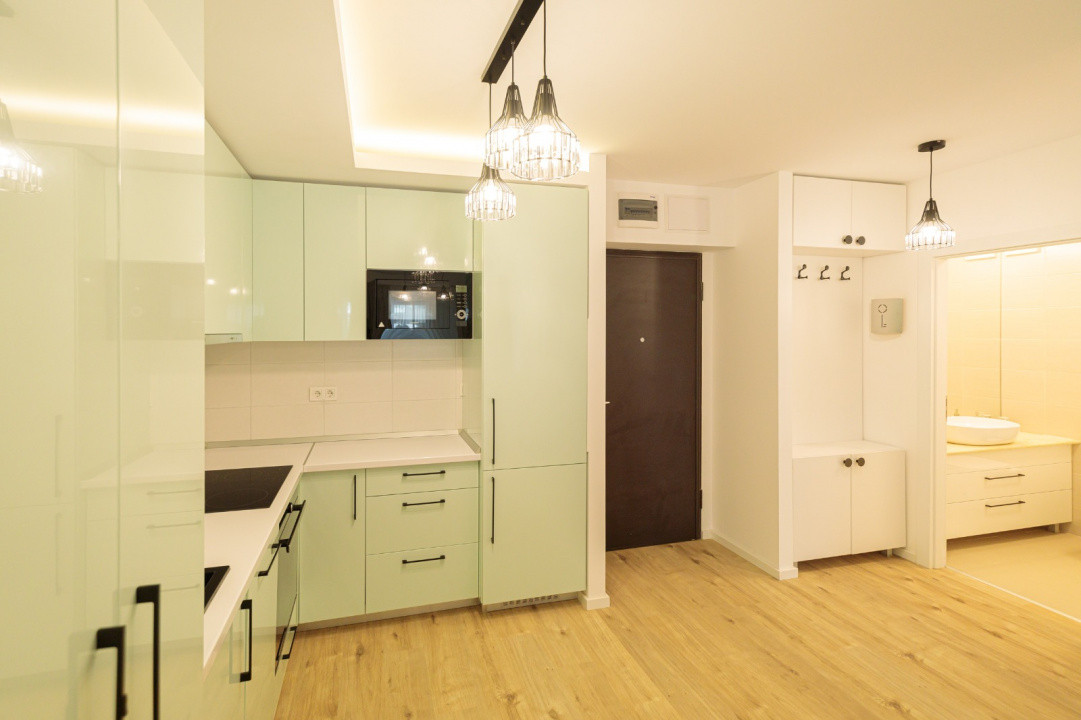 Compartimentarea include un living open-space cu bucatarie complet echipata, un dormitor confortabil si o baie. Spatiul beneficiaza de centrala termica proprie cu incalzire in pardoseala, aer conditionat, TV smart, masina de spalat rufe, combina frigorifica incorporabila, cuptor electric cu functie pirolitica, masina de spalat vase, cuptor cu microunde si uscator de rufe — toate dotarile necesare pentru confortul de zi cu zi.