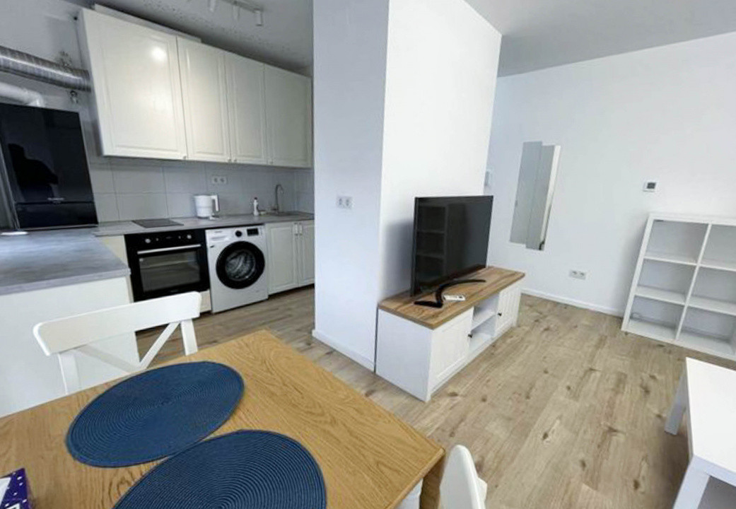 Apartamentul este decomandat, are o suprafata de 54 mp si este situat la etajul 9 din 10, oferind luminozitate buna si o pozitionare superioara in imobil. Compartimentarea este eficienta, cu living si bucatarie open space, dormitor separat si un avantaj rar pentru aceasta tipologie: doua bai, care aduc un plus real de confort si functionalitate.