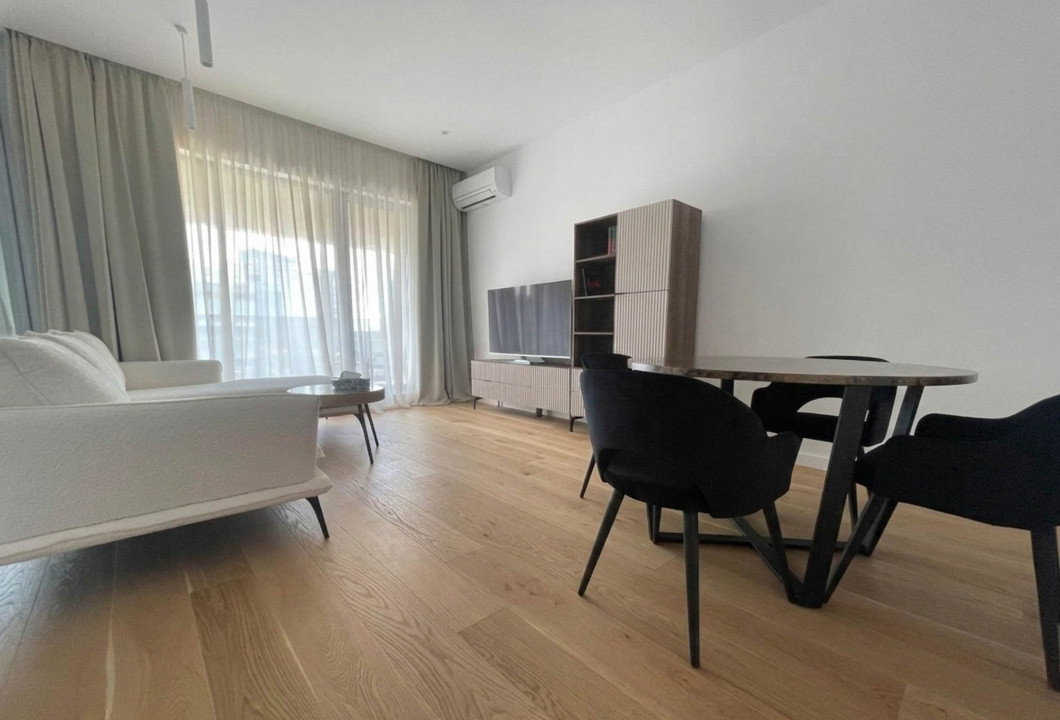Apartamentul este mobilat si utilat premium, cu mobilier Rovere Mobili si bucatarie Veneta Cucine. Zona de zi este bine proportionata, iar terasa ofera un spatiu exterior real, cu vedere deschisa.