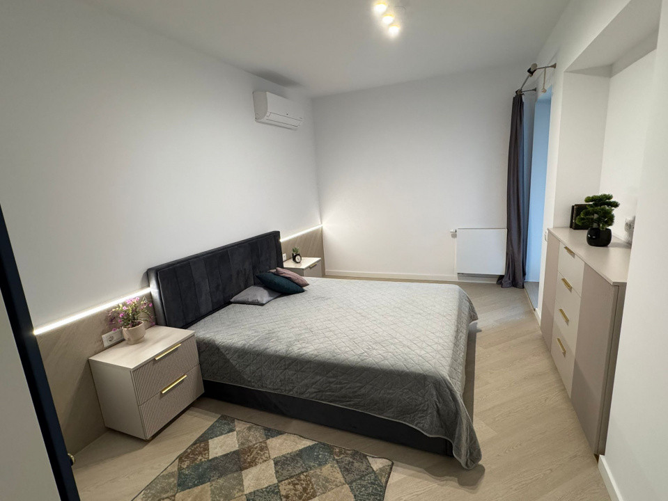 Apartamentul este decomandat, iar accesul către balcon se face atât din living, cât și din dormitor. Este complet utilat și mobilat, beneficiind de toate electrocasnicele necesare, precum și de 2 sisteme de climatizare. Proprietatea este la prima închiriere.