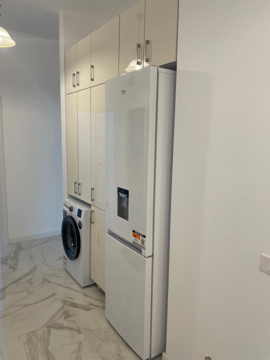 Electrocasnice premium: combină frigorifică, plită pe gaz, cuptor electric, microunde, hotă, mașină de spălat, aer condiționat și 2 televizoare.