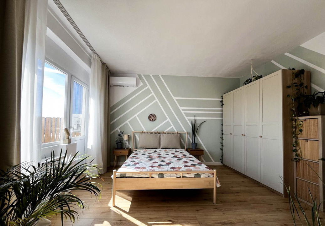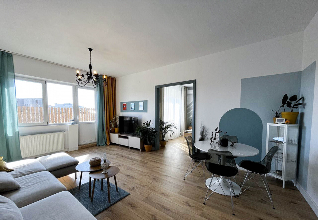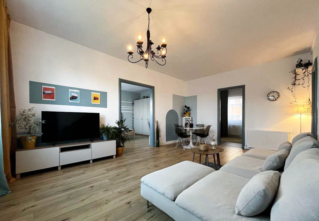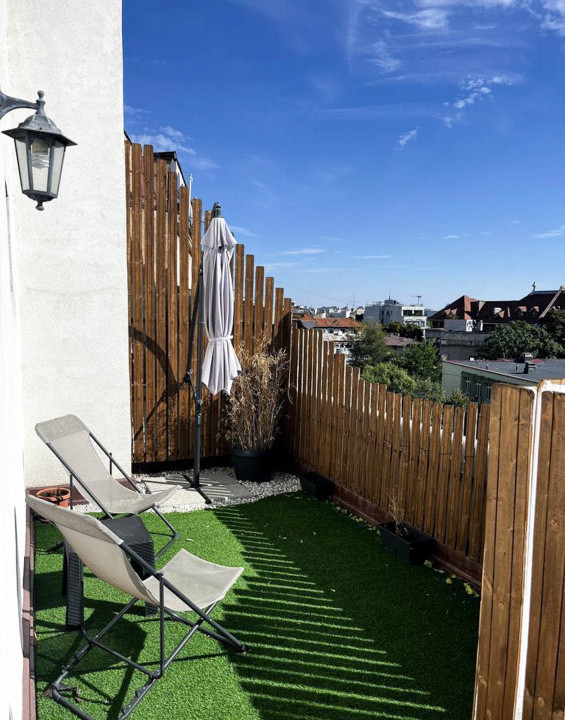 Configurarea interioara este ideala atat pentru rezidenta, cat si pentru business: living generos, dormitor matrimonial, birou/dormitor secundar (toate cu acces la terasa sau balcon), doua bai complete si un grup sanitar de serviciu. Tavanul inalt de 3 m, luminozitatea excelenta si stilul Mid-Century Modern confera un ambient distinct si elegant. Apartamentul este complet mobilat si utilat, dispune de centrala termica proprie si ofera un nivel ridicat de confort si intimitate.