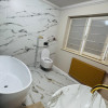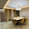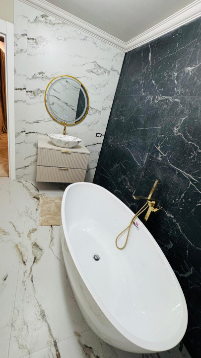 Dormitorul principal este decorat în tonuri neutre, cu detalii elegante și draperii grele din catifea, emanând confort și rafinament. Dressingul generos, complet echipat, aduce un plus de funcționalitate și lux cotidian.