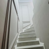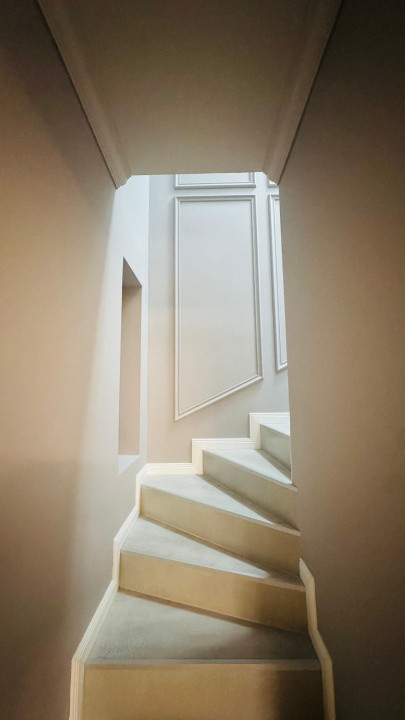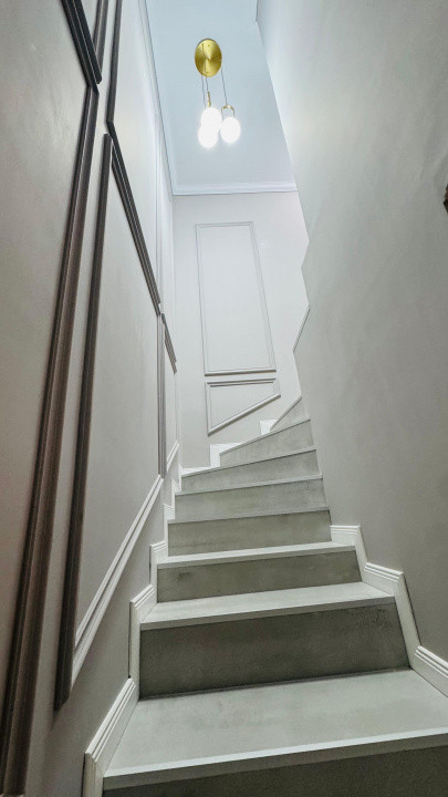 Scara interioară, decorată cu profile fine și iluminat modern, completează perfect designul coerent al întregii locuințe.