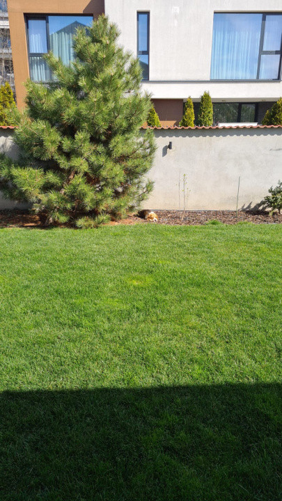 Grădină Matura: Un spațiu exterior deja amenajat, cu arbori și vegetație care transformă curtea într-o oază de relaxare imediată.
